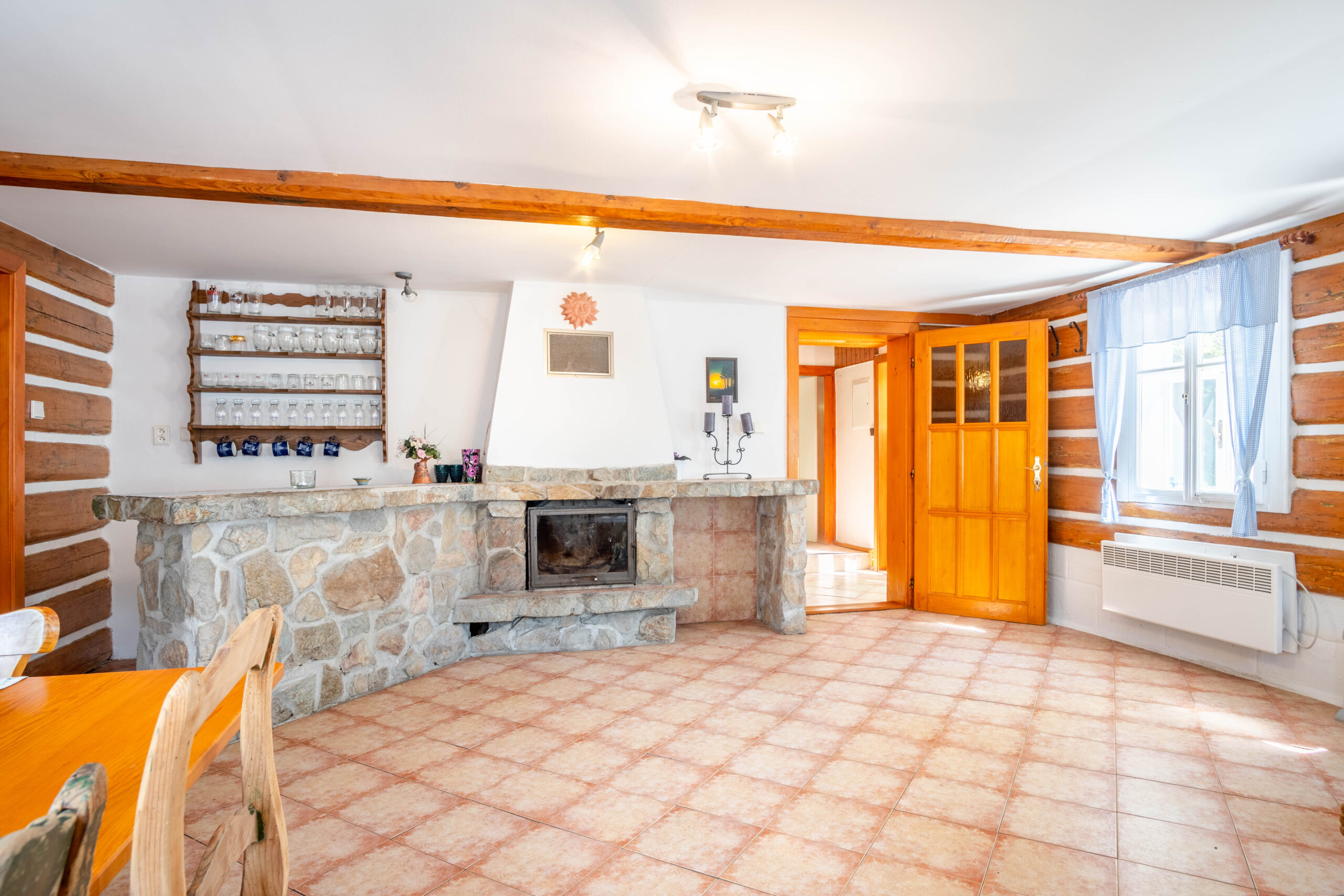 • Společenská místnost s velkým stolem, pohodlným sezením, krbem a minibarem s nabídkou piva a vína.
